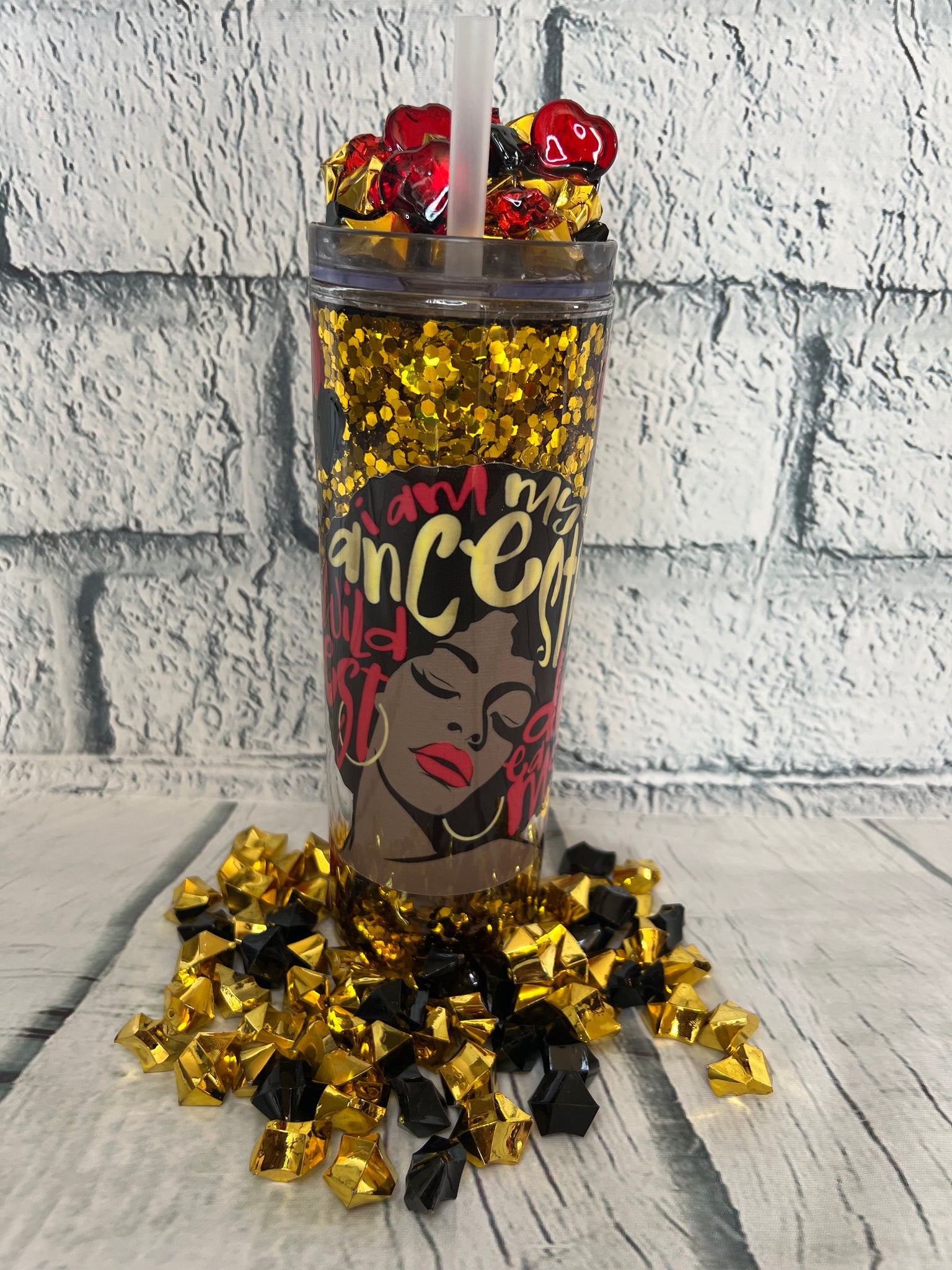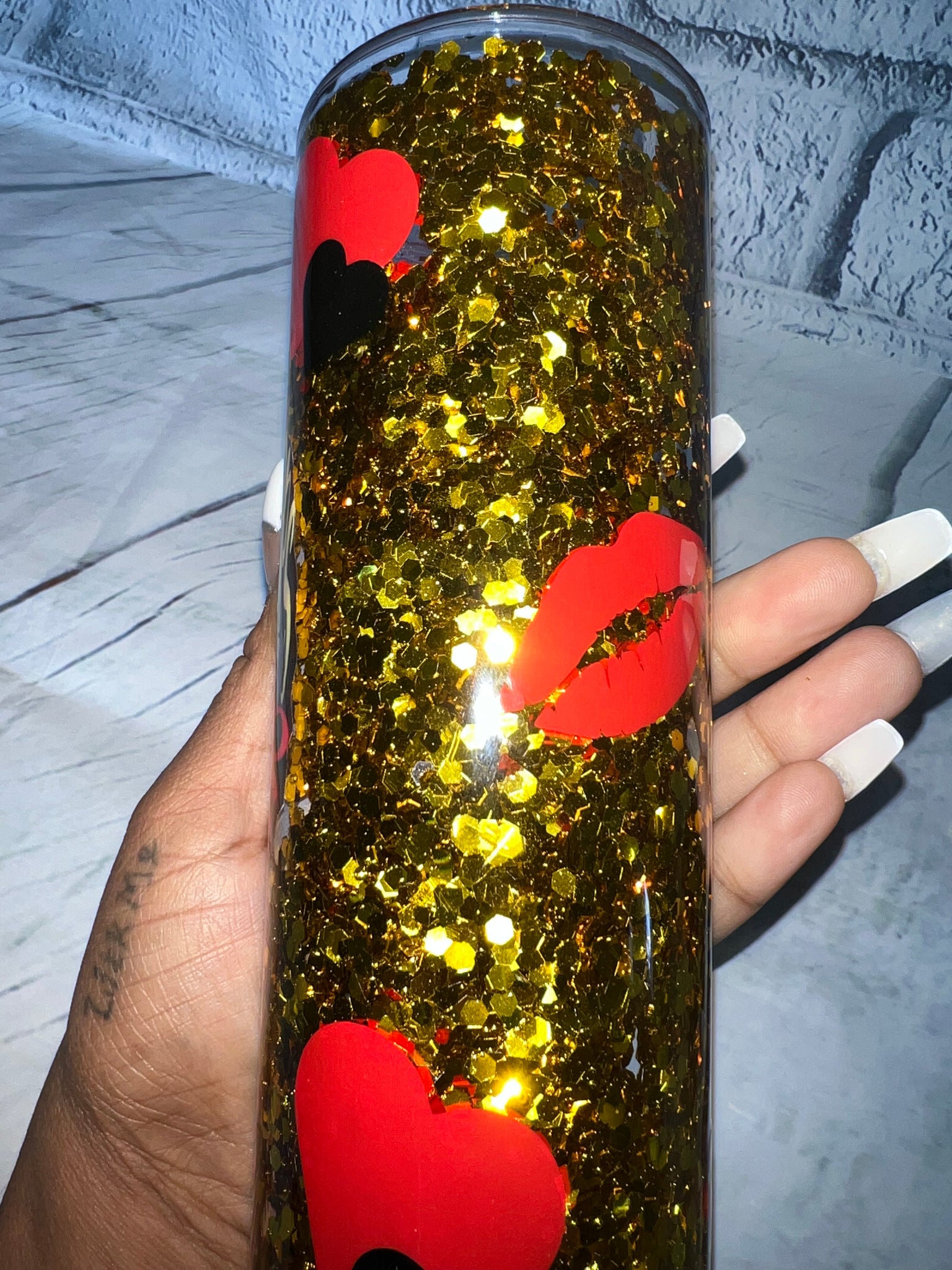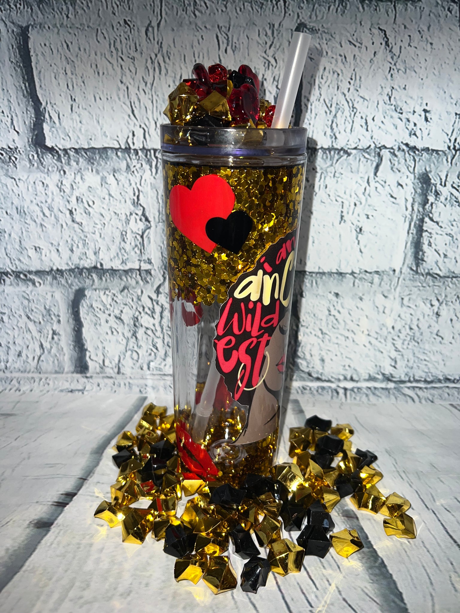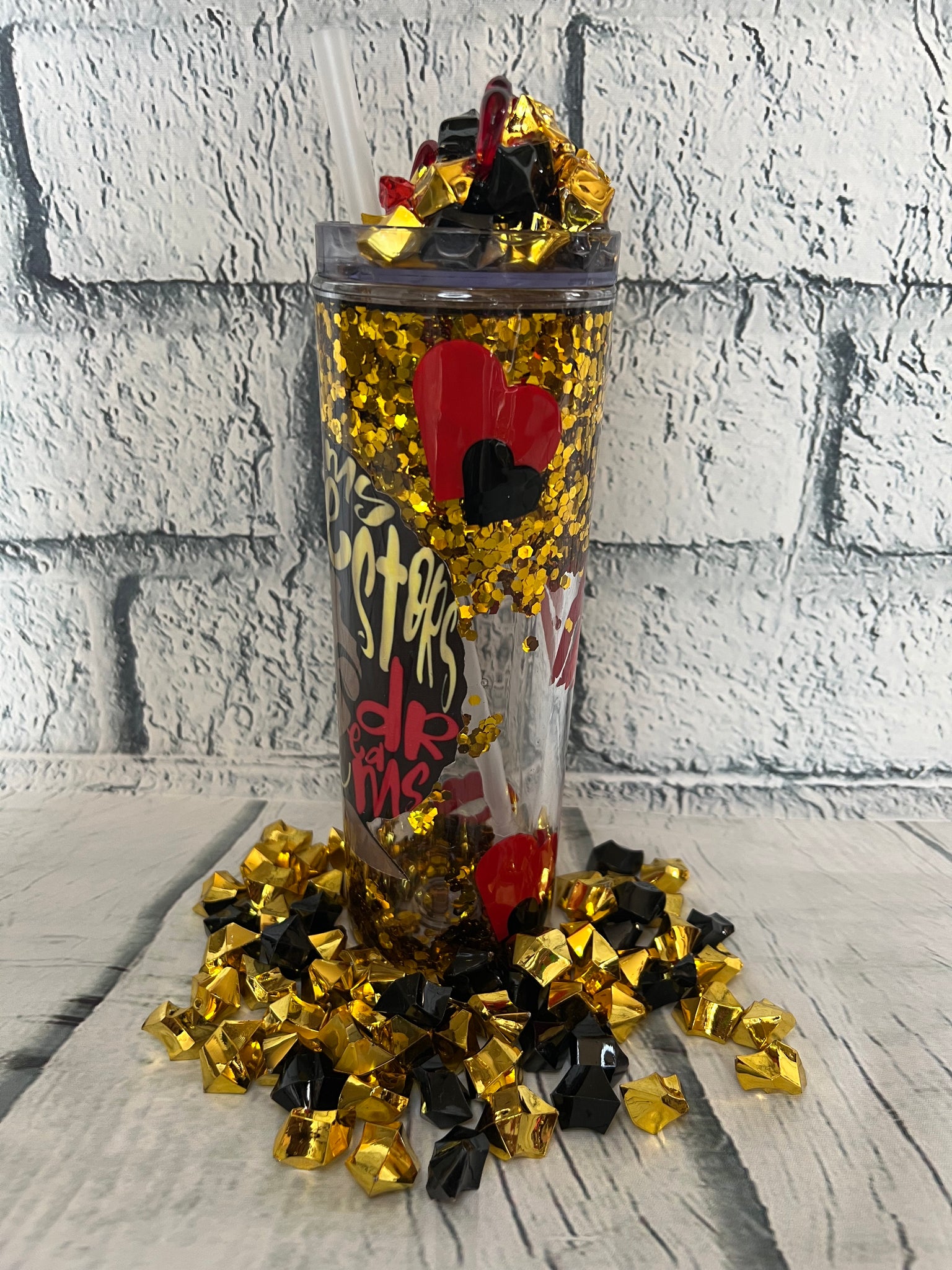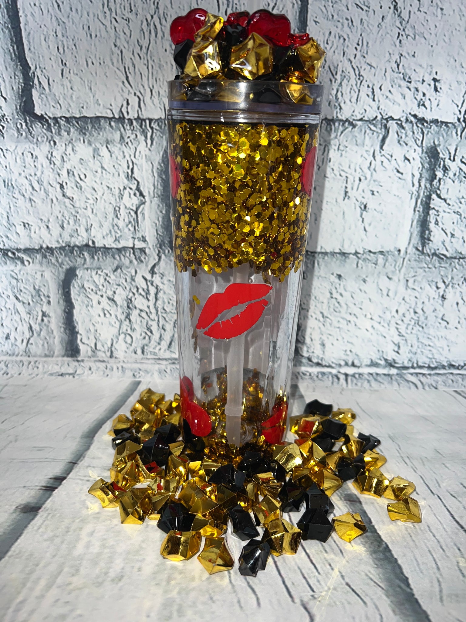 Beautifully designed for vibrance. Beautified with black and gold ice. It also displays red/black hearts, lips, and elegance. This tumbler was beautifully designed with you in mind. 'I Am' has an 18-ounce capacity and redesigned press on lid allows you to sip directly or use the included matching straw. It is made from the highest quality crystal clear acrylic is 100% BPA free and the sleek slim body makes it comfortable to take to go. It's double wall construction provides insulation of all your hot and cold liquids, such as coffee, iced tea, water and smoothies. Its snow globe effect is beautiful. Tumbler is to be shaken, while empty, for the full effect. Tumbler is not battery operated. Tumbler is to be HANDWASHED and SIT TO DRY. I hope this tumbler is a delight for your valentine. Don't forget to check out her friends. Stay Forever Vibrant! Enjoy :)