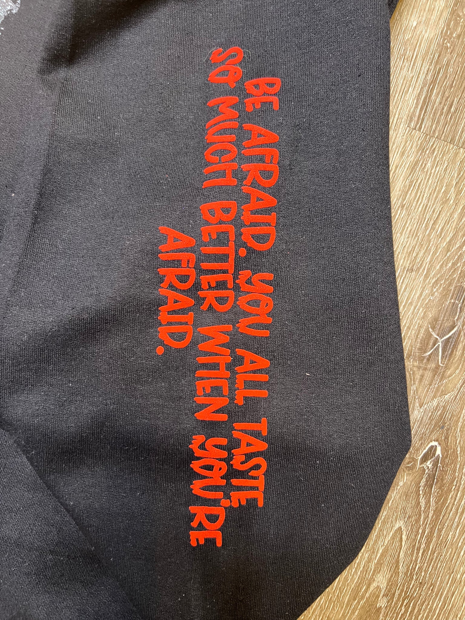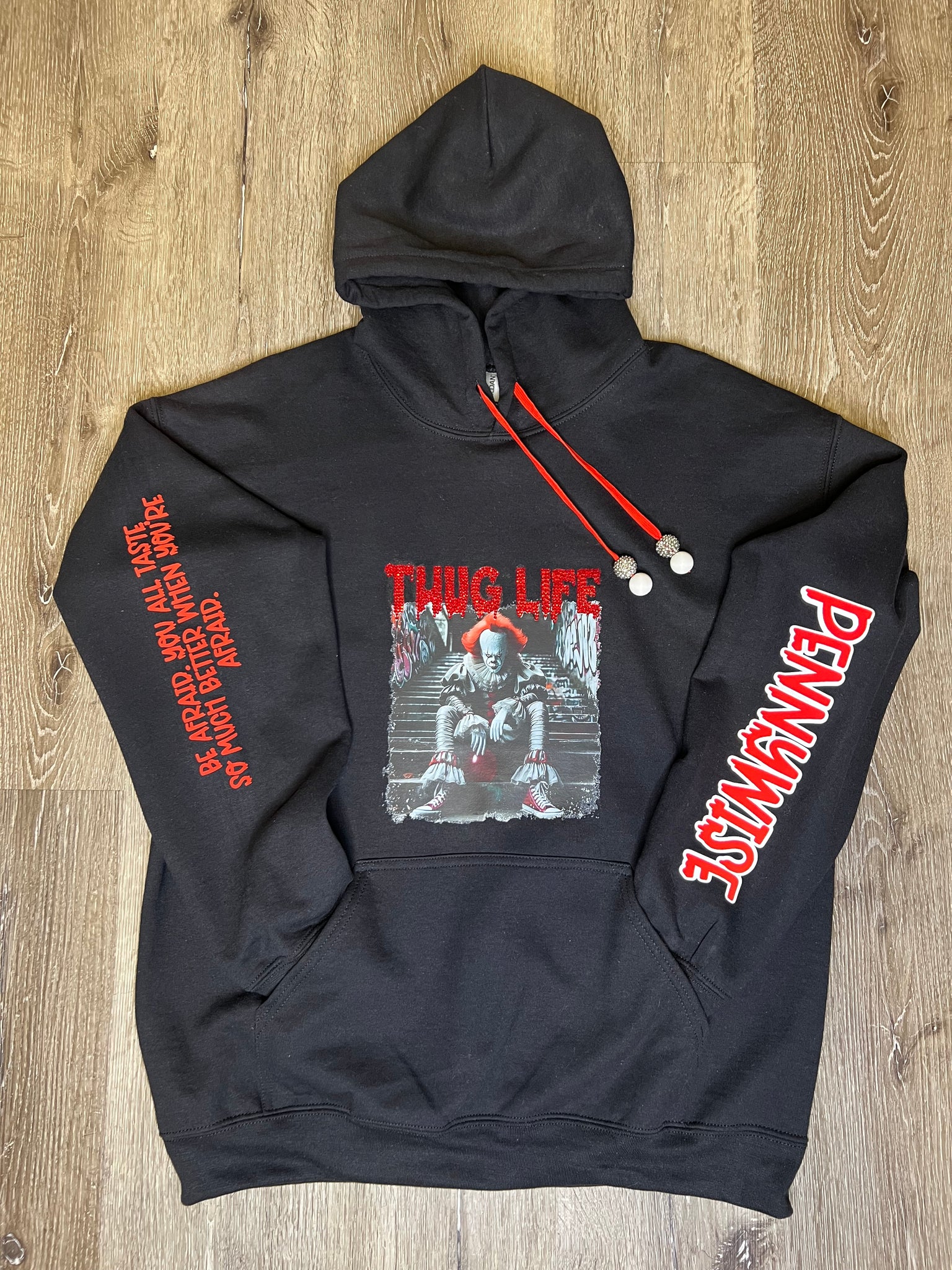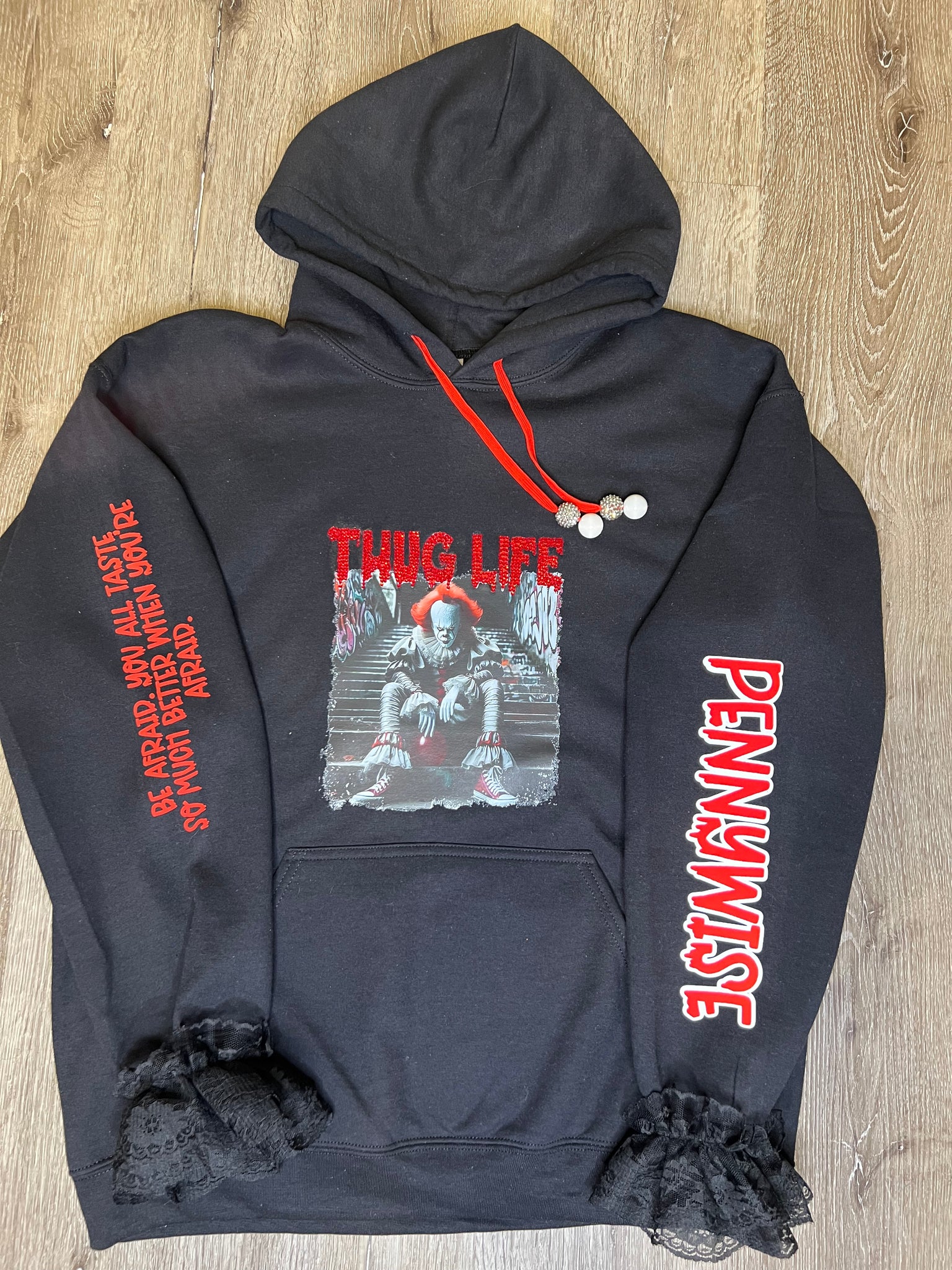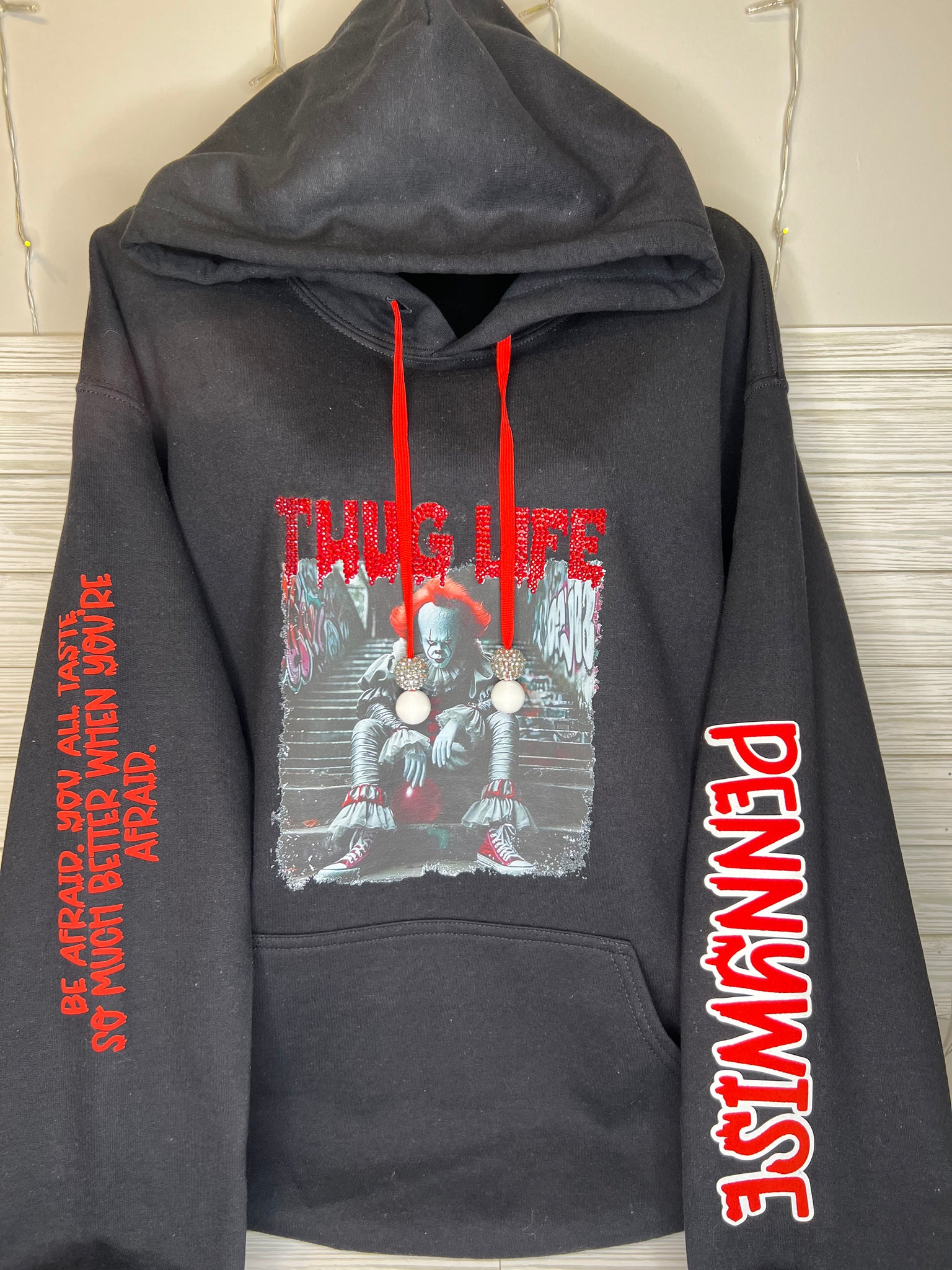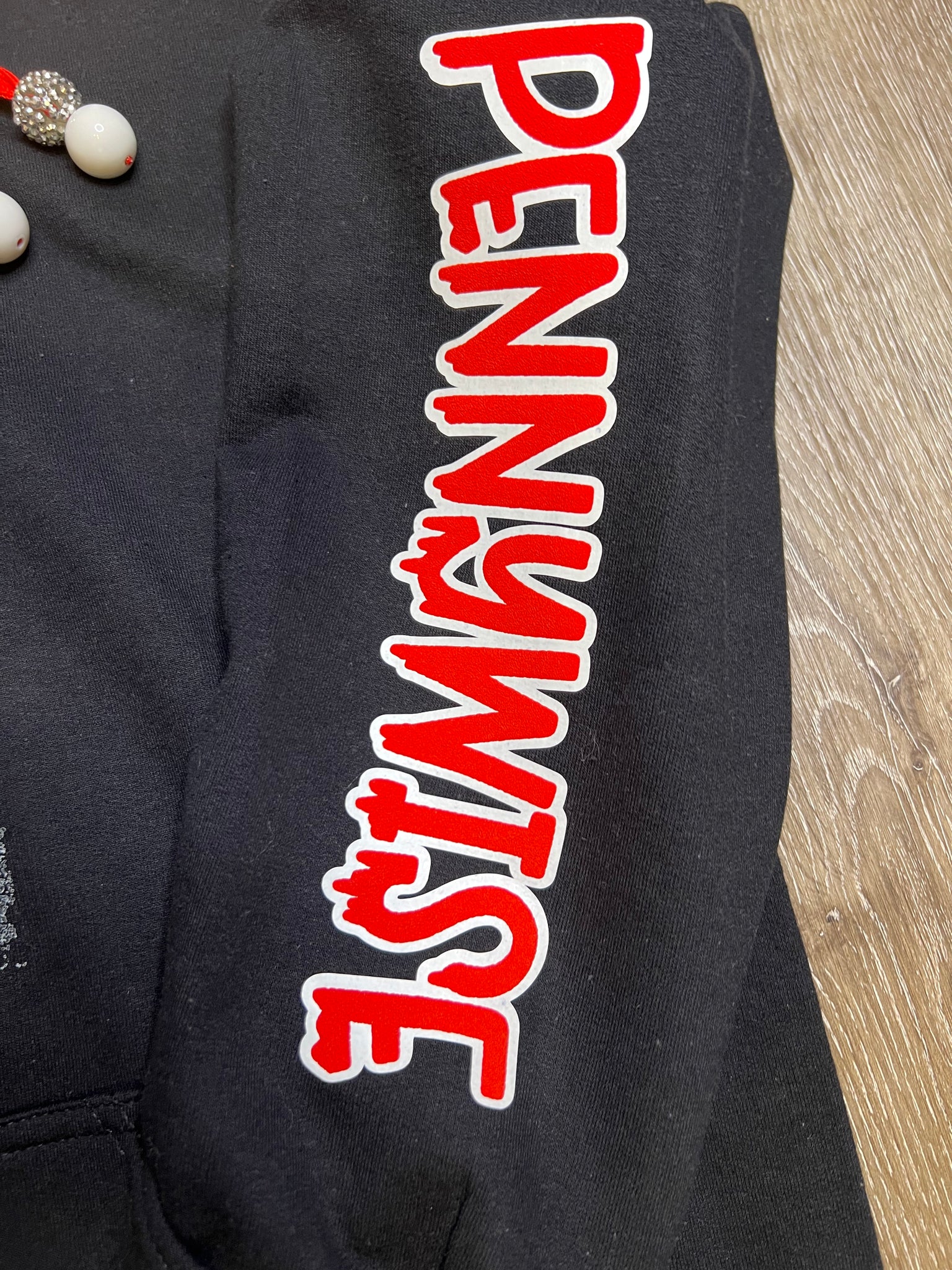 This 'Pennywise' hoodie is perfect for horror fans with its iconic 'Be afraid' quote and scary red balloon imagery. Stand out with a unique hoodie, it's sure to remind you of the sewer scary scene. It will make a great gift for any Pennywise fan, not just for Halloween but all year round. It also comes with removeable clown like lace cuffs. Get yours now!